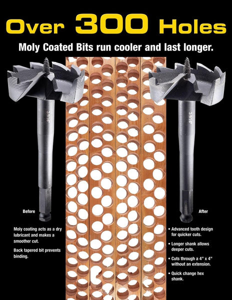 Drill Hog is proud to release the newest technology in Self Feed Drill Bits. These bits are made of Molybdenum M7 Steel. Molybdenum has a melting point of 4753° Fahrenheit! These bits run cooler and last longer than other bits!