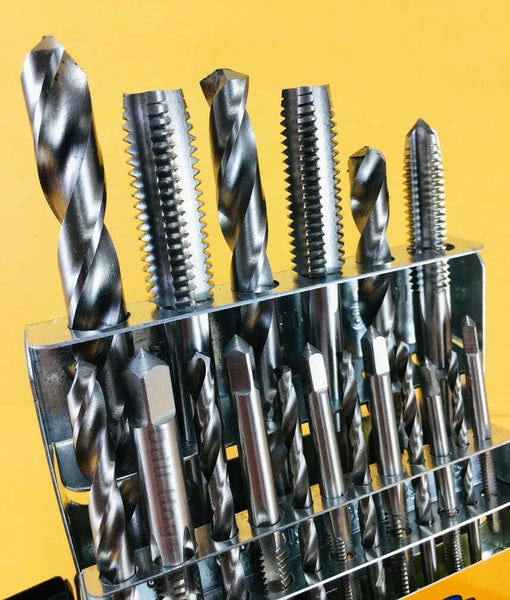 Drill Hog is proud to release brand new technology in our tap & drill set. These drills and taps bits are made from Niobium NbC Steel. Niobium has a melting point of 4,476 degrees Fahrenheit! All of the taps have matching drills included. These bits will drill through the toughest steel like truck frames, stainless steel, farm implements, spring steel, grade 8 bolts, and more!